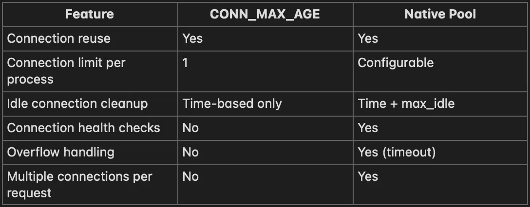 - Django 5.1 native pooling is usually enough — Simple configuration, good performance.
